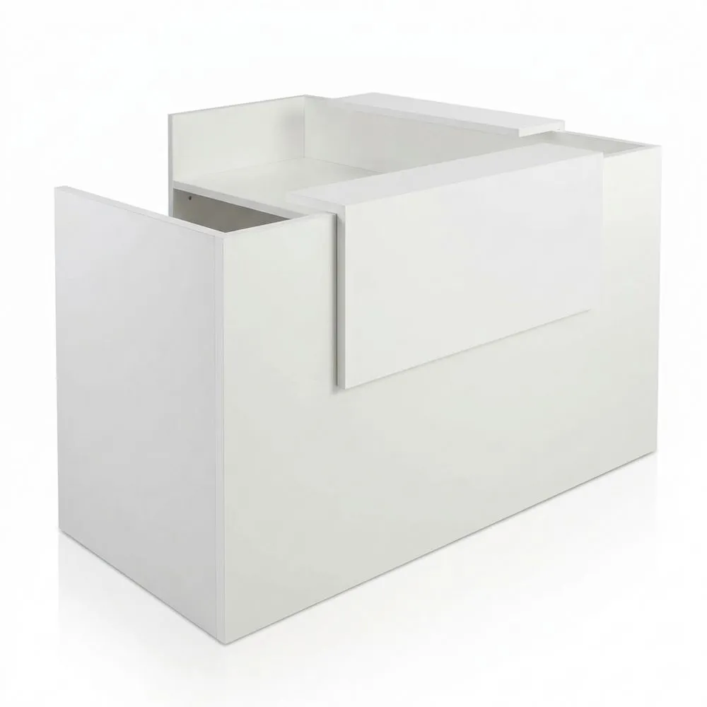 Mostrador para oficinas y negocios con diseño en esquina, en forma de L. La esquina se encuentra en el lado izquierdo al mirar desde el interior y siempre será de un tamaño igual o menor al frente. DIMENSIONES DEL PRODUCTO: altura de 105 cm y profundidad de 60 cm. Puedes elegir el ancho tanto de la esquina como del frente. Gracias a su tablero interior, puedes colocar todos los elementos necesarios para realizar tu trabajo. Proporciona soporte adecuado para los objetos colocados. Diseño funcional y adaptable. El mostrador es blanco y puedes elegir el color de las superficies entre: blanco, arce, roble, nogal y gris grafito.
