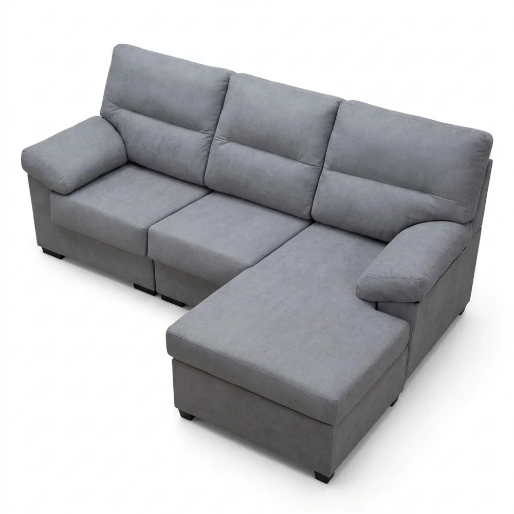 Sofá de 4 plazas con chaise longue, proporcionando un espacio donde puedes relajarte, ver televisión o leer. Diseñado para ser funcional en diversos espacios. El armazón está hecho de madera de pino y aglomerado, mientras que las patas delanteras son de madera de wengué y las traseras de plástico. Medidas: 265 (Ancho) x 100 (Alto) x 152 (Fondo).
